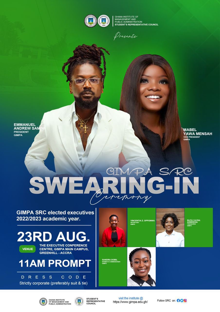 Newly elected Students Representative Council (SRC) President of the Ghana Institute of Management and Public Administration (GIMPA), Emmanuel Andrews Samini, together with his Vice, Mabel Yawa Mensah and other executives will take the oath of office tomorrow.
