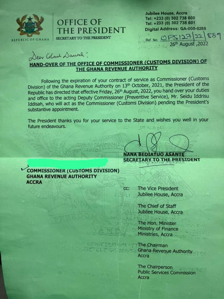 Mr Akufo-Addo in a letter to him dated 26th August 2022 said “Following the expiration of your contract of service as Commissioner (Customs Division) of the Ghana Revenue Authority on 13th October 2021, the President of the Republic has directed that effective Friday 26th August 2022 you hand over duty and office to the Acting Deputy Commissioner (Preventive Service) Mr Asiedu Iddisah, who will act as the Commissioner (Customs Division) pending the President’s substantive appointment.