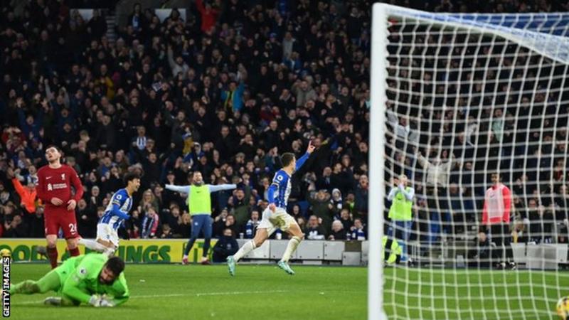Brighton moved above Liverpool in the Premier League standings as Solly March’s double and a late Danny Welbeck strike condemned Jurgen Klopp’s side to a dismal defeat at Amex Stadium.