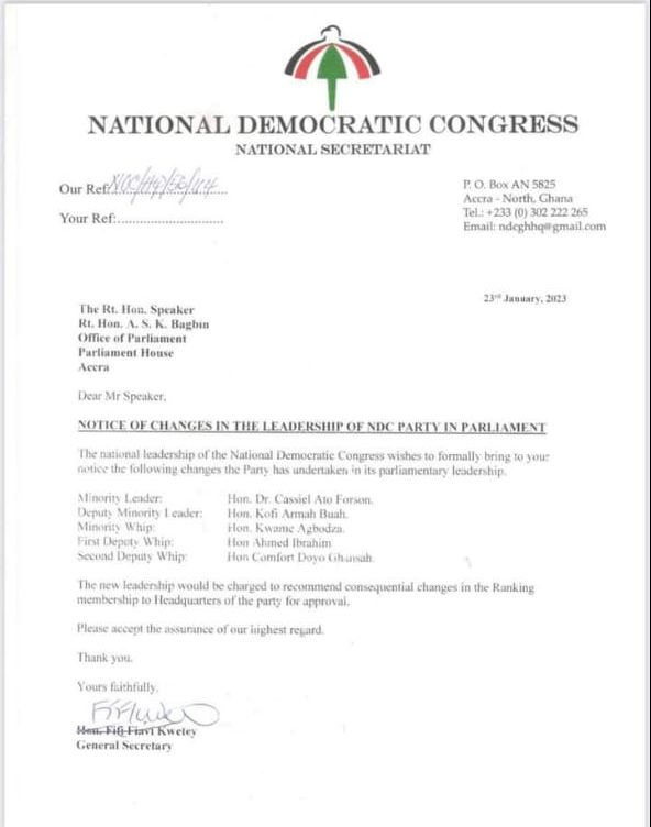 The National Democratic Congress (NDC) has made changes to its leadership in Parliament, Citi News can confirm.
