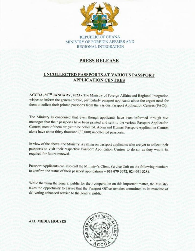 The Ministry of Foreign Affairs and Regional Integration has called on applicants who are yet to collect their passports to visit their respective Passport Application Centres to claim them.