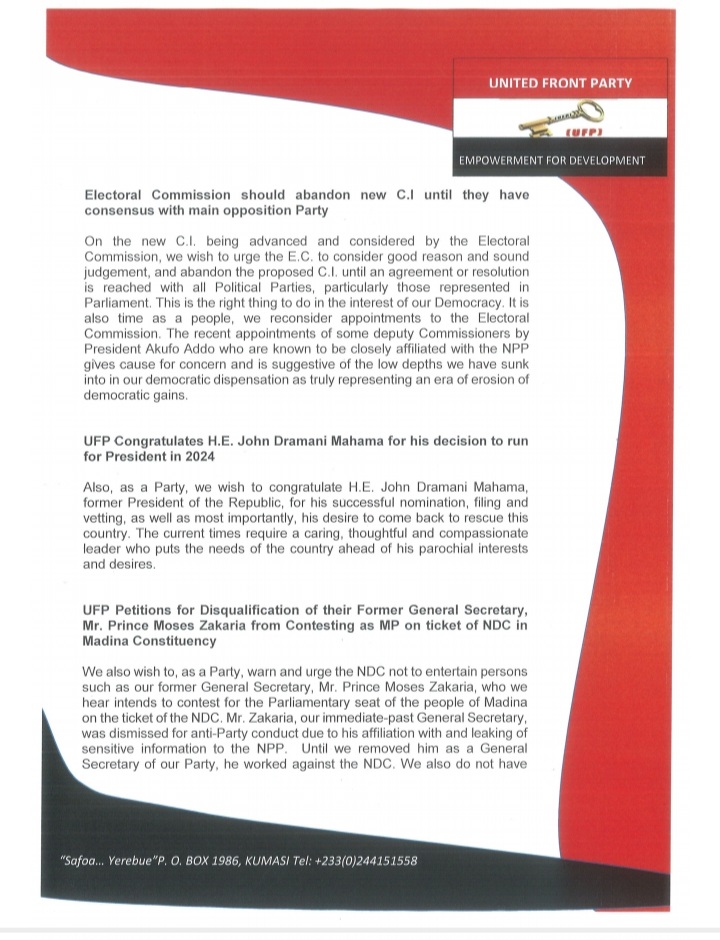 Authorities of United Front Party (UFP), headed by Dr. Nana Agyenim Boateng (Gyataba) has petitioned the National Executive Council (NEC) of the NDC to disqualify their Former General Secretary, Mr. Prince Moses Zakaria from Contesting in their upcoming parliamentary primaries in Madina.