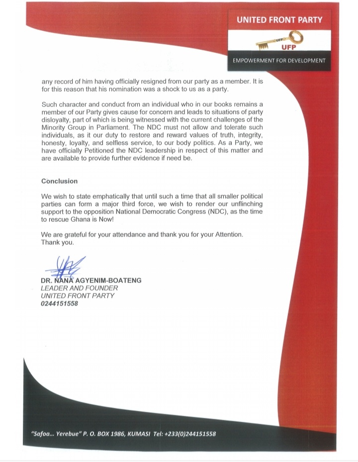 Authorities of United Front Party (UFP), headed by Dr. Nana Agyenim Boateng (Gyataba) has petitioned the National Executive Council (NEC) of the NDC to disqualify their Former General Secretary, Mr. Prince Moses Zakaria from Contesting in their upcoming parliamentary primaries in Madina.