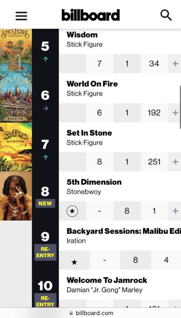 Sitting pretty at number 8 on the charts, 5th Dimension joins a number of albums including Legend: The Best Of Bob Marley And The Wailers by Bob Marley And The Wailers, Best Of Shaggy: The Boombastic Collection by Shaggy, Dutty Classics Collection by Sean Paul, Gifted by Koffee and many others.