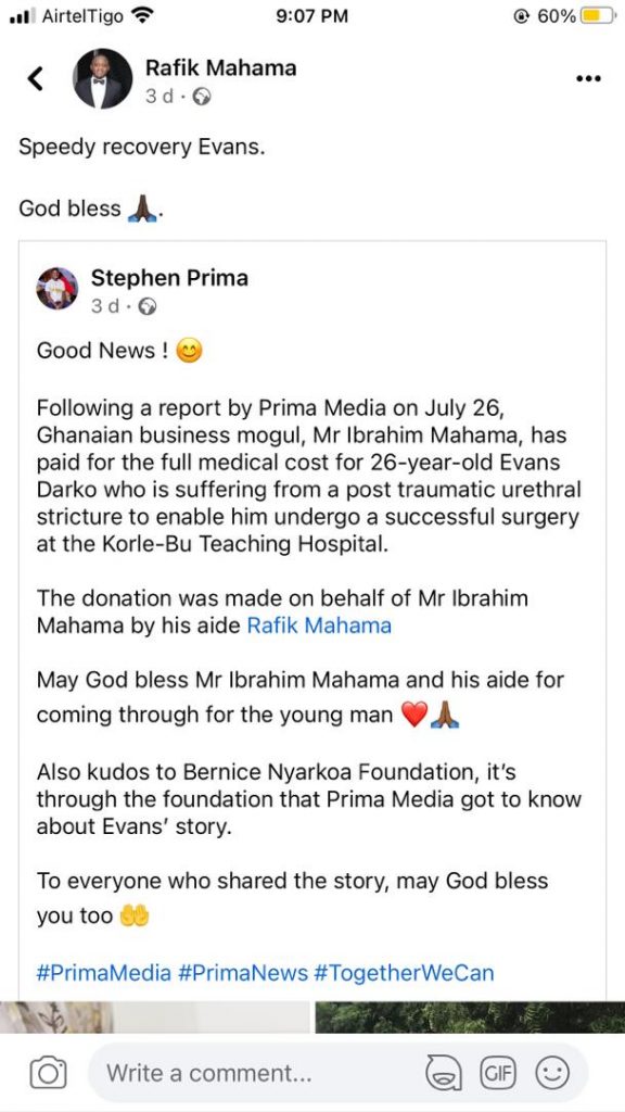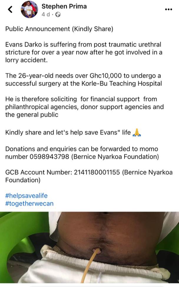 Ghanaian business mogul, Mr Ibrahim Mahama has come to the rescue of a 26-year-old Evans Darko who is suffering from a post traumatic urethral stricture.