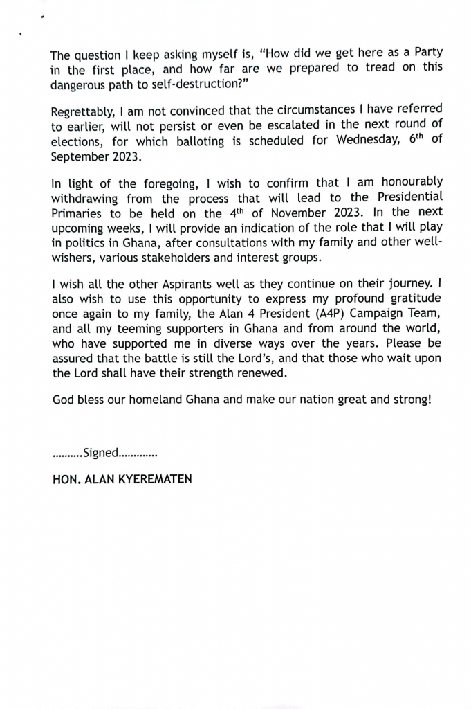 In light of the foregoing, I wish to confirm that I am honourably withdrawing from the process that will lead to the Presidential Primaries to be held on the 4th of November 2023. In the next upcoming weeks, I will provide an indication of the role that I will play in politics in Ghana, after consultations with my family and other well- wishers, various stakeholders and interest groups.