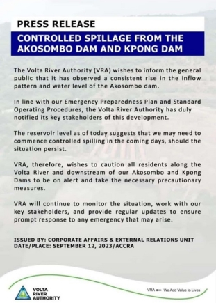 The Volta River Authority (VRA) has caution residents downstream of Akosombo and Kpong dams to be alert and take precautionary measures following a controlled spillage in the coming days.