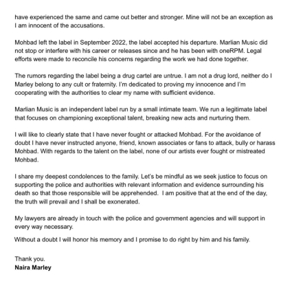 “The rumours regarding the label being a drug cartel are untrue. I am not a drug lord, neither do I Marley belong to any cult or fraternity. I’m dedicated to proving my innocence and I’m cooperating with the authorities to clear my name with sufficient evidence.