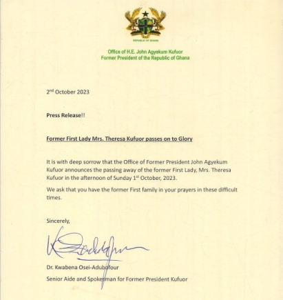 Former First Lady of Ghana, Theresa Kufuor has passed on at age 87.