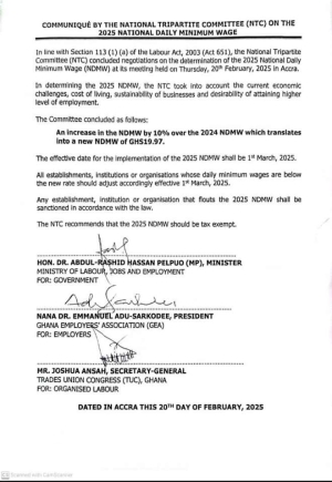 The National Tripartite Committee (NTC) has announced a 10 per cent increase in Ghana’s National  Daily Minimum Wage (NDMW) for 2025, bringing the new rate to GH₵19.97. The decision was reached at a meeting held in Accra on Thursday, 20th February 2025.