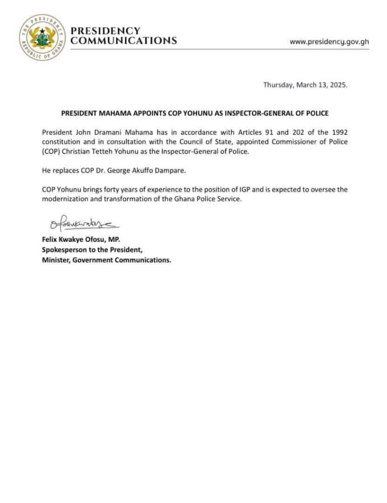 President John Dramani Mahama has appointed Commissioner of Police (COP) Christian Tetteh Yohunu as the new Inspector-General of Police (IGP), replacing COP Dr. George Akuffo Dampare.