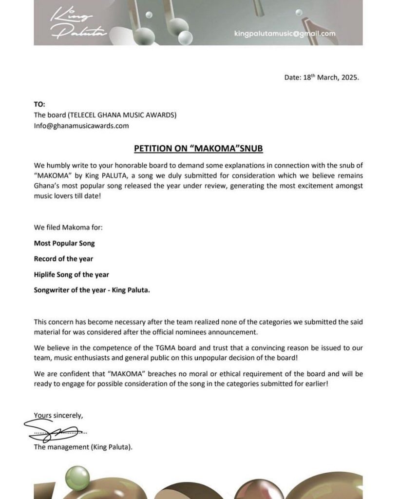King Paluta’s management team has written to the Telecel Ghana Music Awards (TGMAs) to express concern and seek explanation for the omission of his popular song ‘Makoma’ from the nominees list.