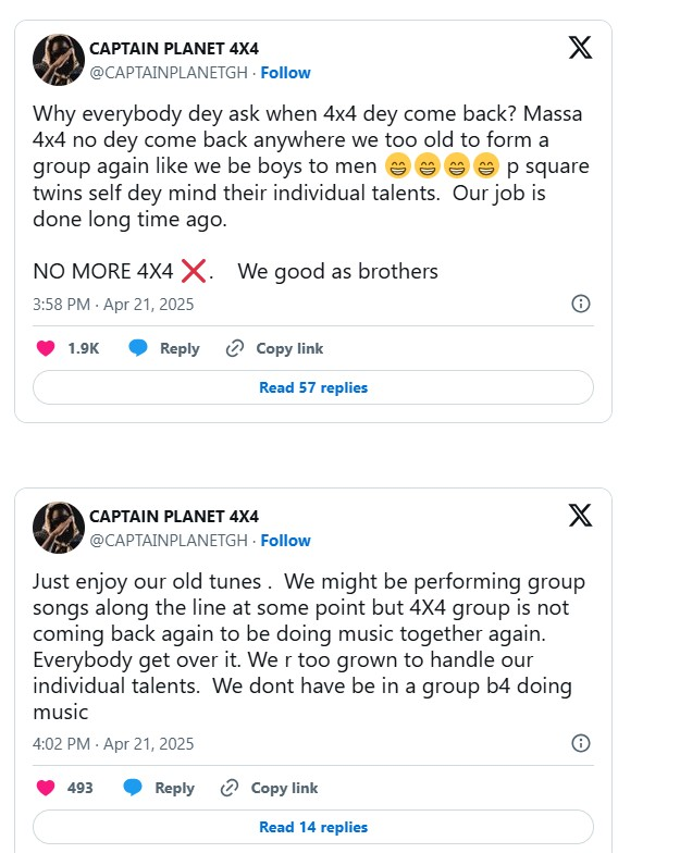 “Why everybody dey ask when 4×4 dey come back? Massa 4×4 no dey come back anywhere we too old to form a group again… Our job is done. Long time ago. No more 4X4. We are good as brothers,” he wrote.