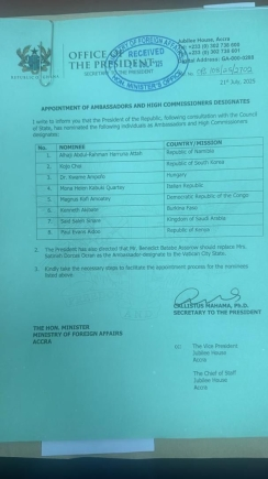 The announcement, detailed in a letter dated July 21, 2025, and signed by Dr Callistus Mahama, Secretary to the President, underscores Ghana’s commitment to advancing its foreign policy and deepening bilateral ties.