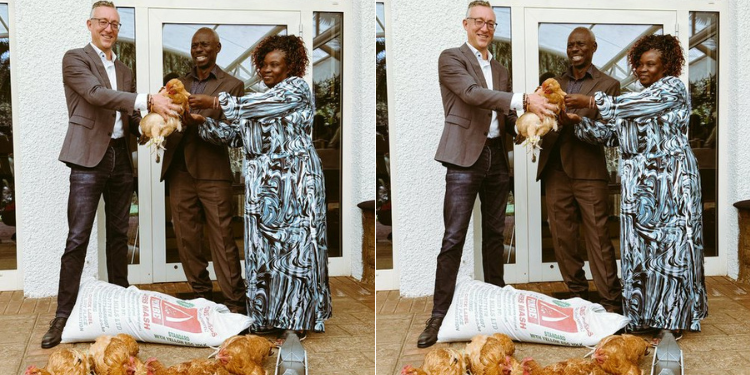 Images shared by the diplomat on X platform showed Groth and Hesbon Imbwaka holding one chicken while four others lay nearby, alongside 50 kg of layers mash and a feeder.