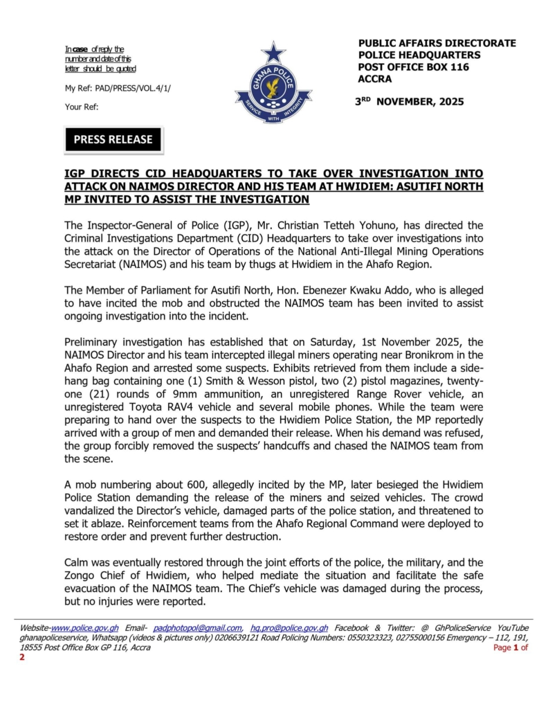 DIRECTS CID HEADQUARTERS TO TAKE OVER INVESTIGATION INTO ATTACK ON NAIMOS DIRECTOR AND HIS TEAM AT HWIDIEM: ASUTIFI NORTH MP INVITED TO ASSIST THE INVESTIGATION