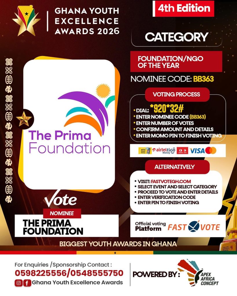 The Prima Foundation has been nominated for Foundation of the Year at the 2026 Ghana Youth Excellence Awards, recognising its sustained humanitarian work and dedication to vulnerable communities across Ghana.