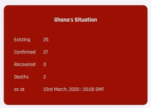 Confirmed COVID-19 cases in Ghana now 27; death toll hits 2 NEWS Confirmed COVID-19 cases in Ghana now 27; death toll hits 2 Prima News24 March 23, 2020 Cases of the novel coronavirus in Ghana have hit 27 while the death toll has hit 2....Read More